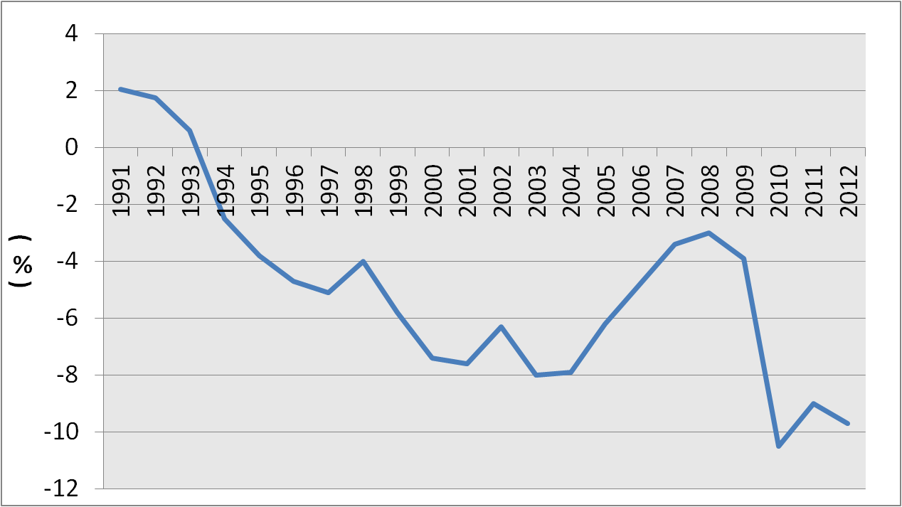 Japan Budget Deficit/Surplus to GDP Ratio 1990-2012