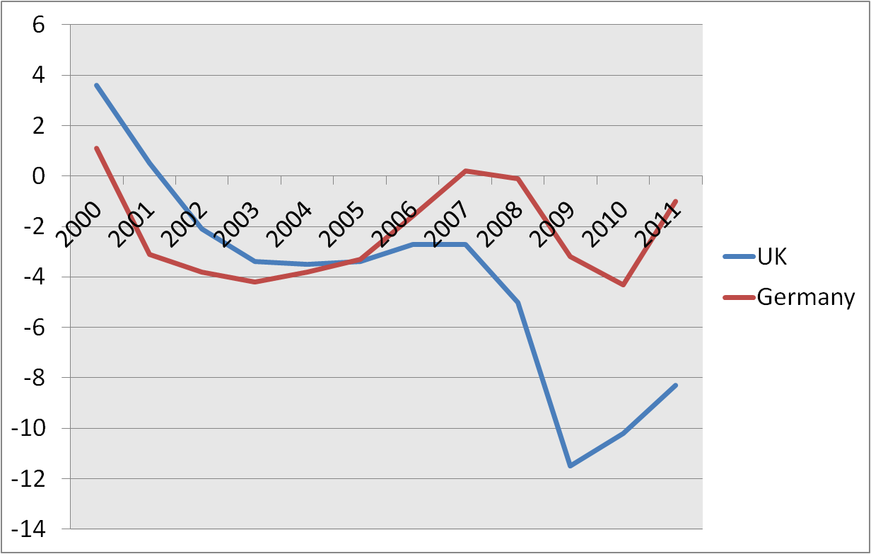 Deficit and Surplus as a percentage of GDP: UK and Germany (2000-2011)